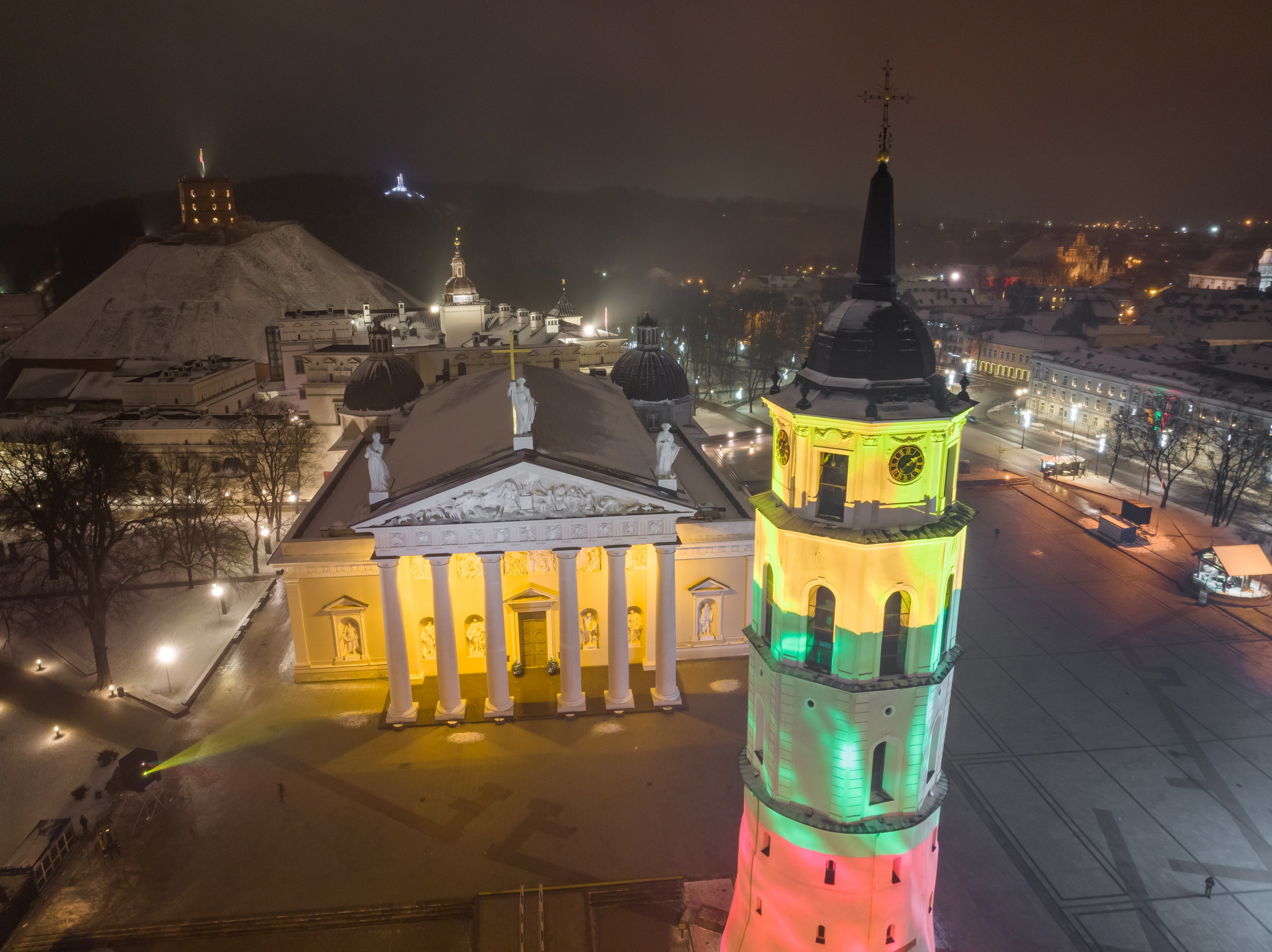 Sausio 1-ąją nuo 1 val. iki 7 val. ryto Vilniaus Varpinę simboliškai nušvies Trispalvė – Lietuvos vėliavos dienos proga.