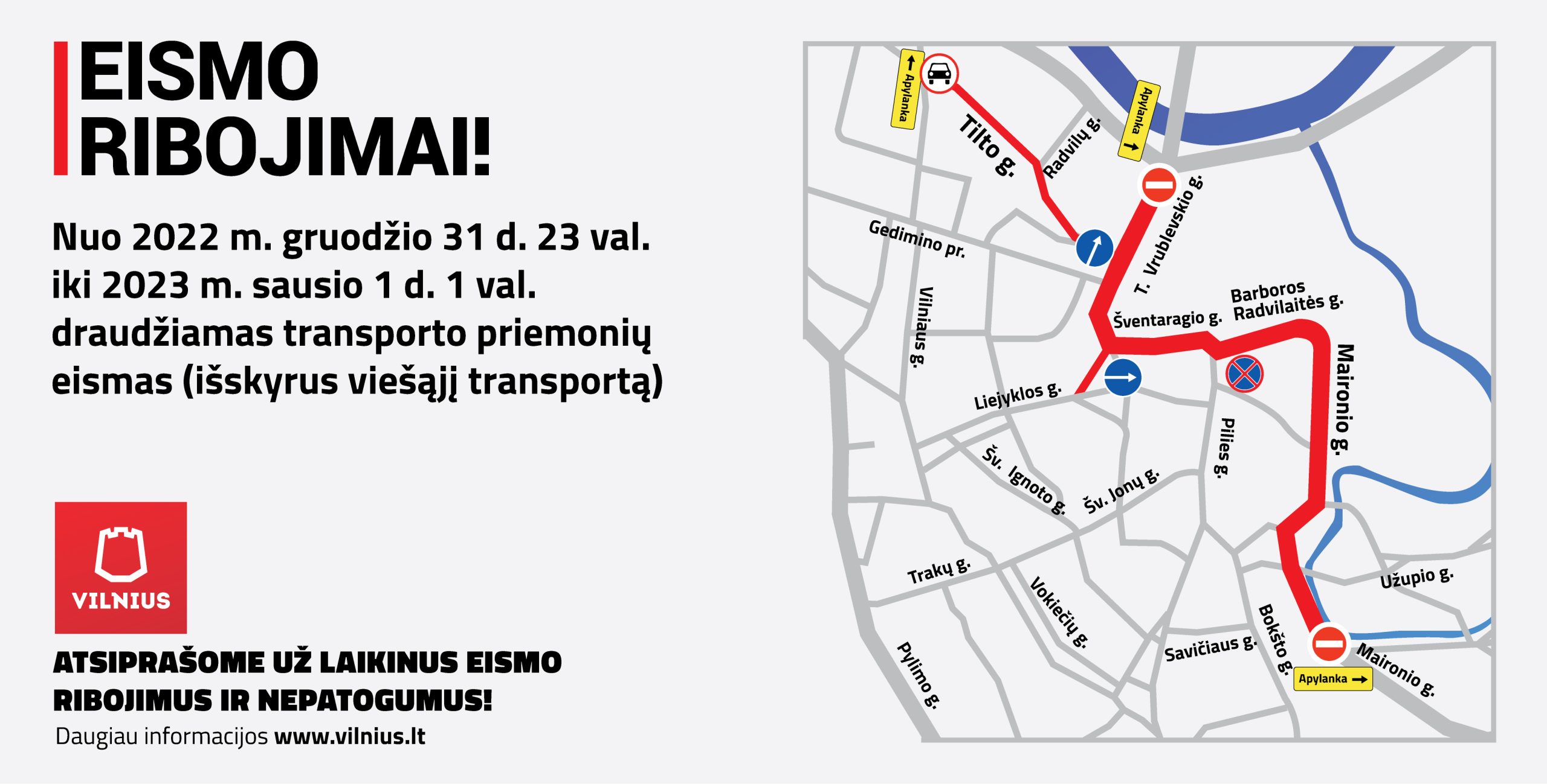 Nuo gruodžio 31 d. 23 val. iki 2023 m. sausio 1 d. 1 val. nakties bus draudžiamas transporto priemonių eismas (įskaitant ir viešąjį transportą) T. Vrublevskio, Šventaragio, Barboros Radvilaitės gatvėmis.