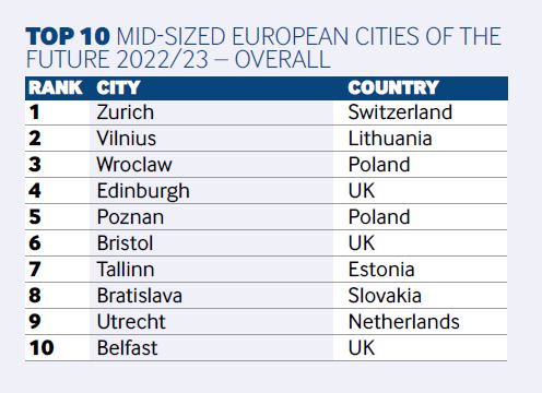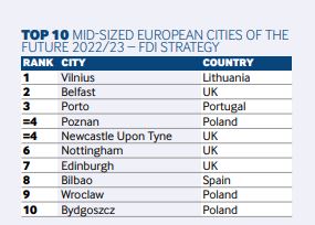 Vilnius vėl pakilo reitinge tarp finansiškai ir ekonomiškai pažangiausių bei versliausių Europos miestų. „Financial Times“ investicijų ekspertų padalinio „fDi Intelligence“ sudaryto reitingo ,,European Cities and Regions of the Future 2022/2023“ bendroje vidutinio dydžio miestų kategorijoje Lietuvos sostinė užėmė antrąją vietą – 2020 m. šiame reitinge ji buvo ketvirta.