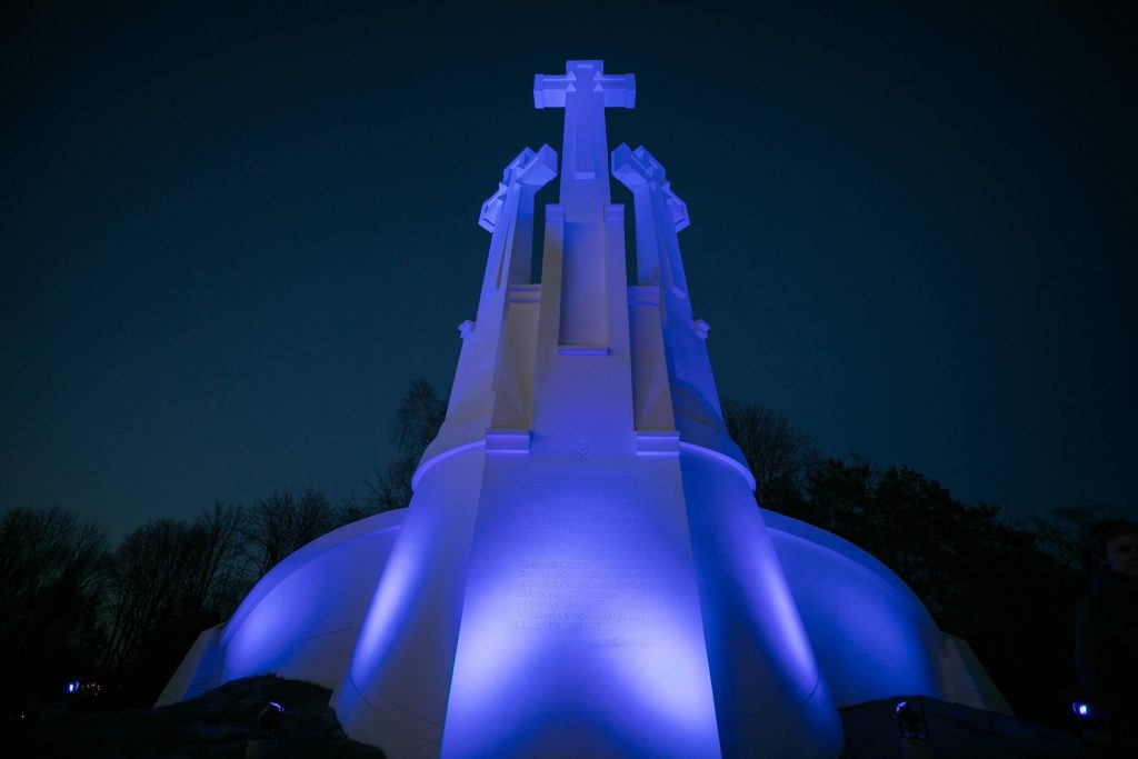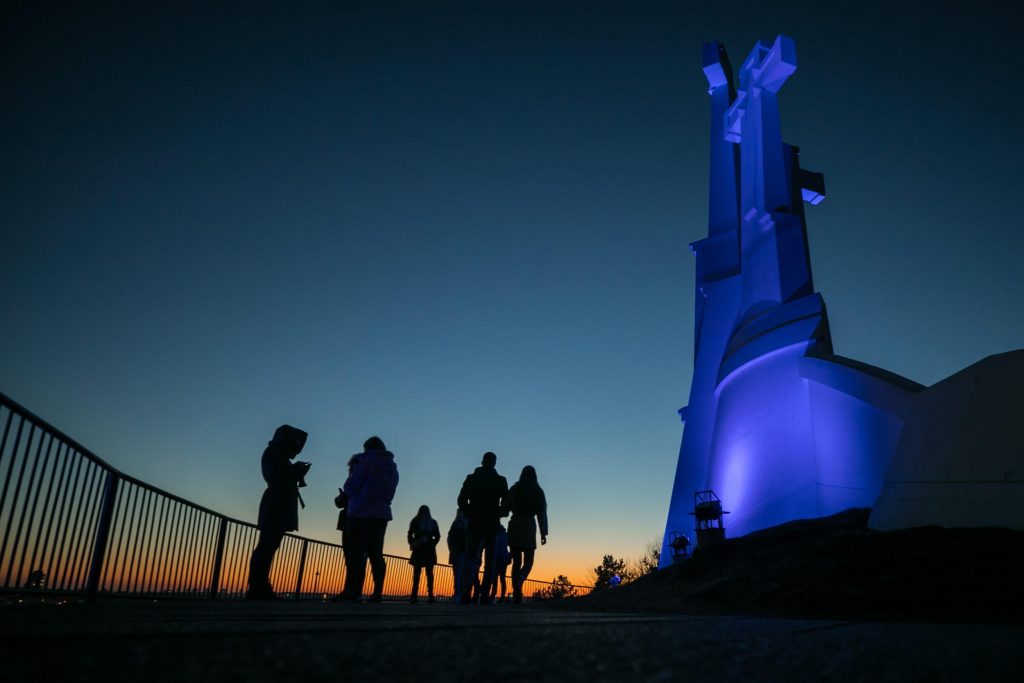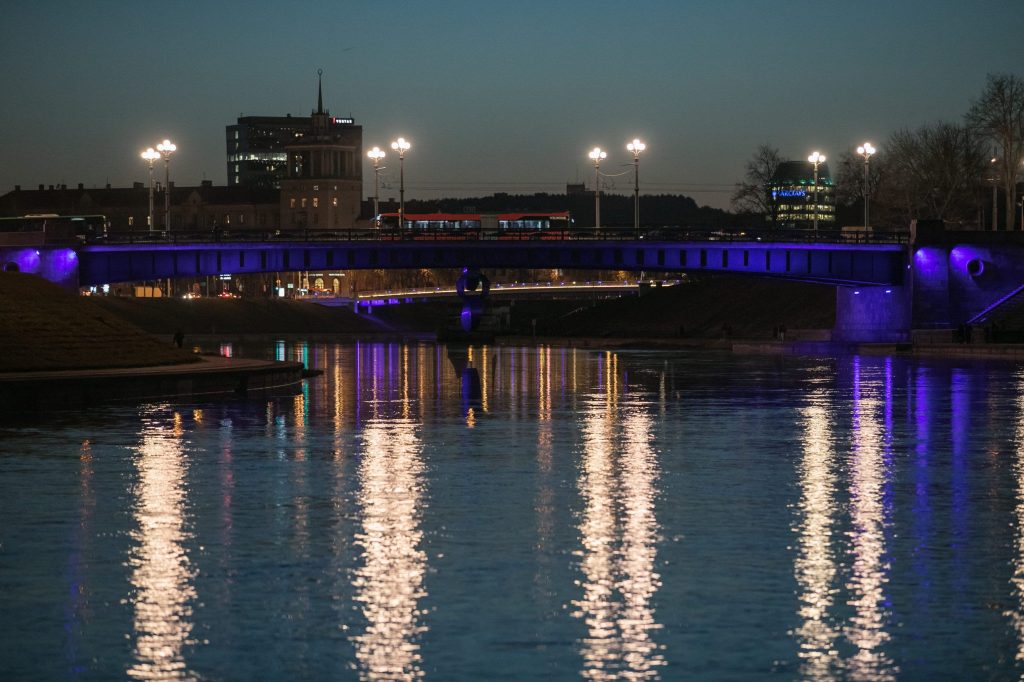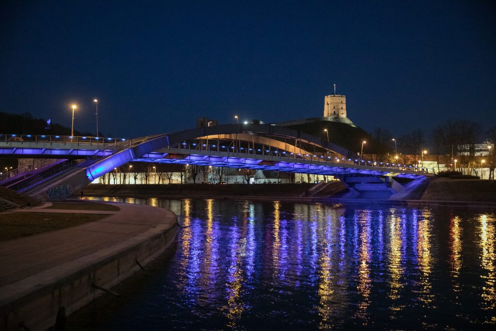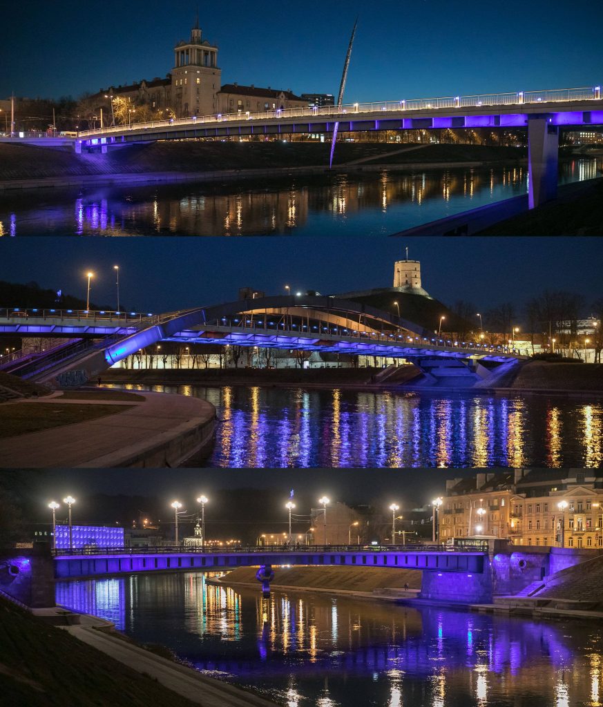 Šįvakar visi kviečiami pasivaikščioti Neries krantine – mėlynai nušvito Karaliaus Mindaugo, Žaliasis ir Baltasis tiltai. Iš tolo mėlynai šviečia ir Trijų kryžių paminklas.