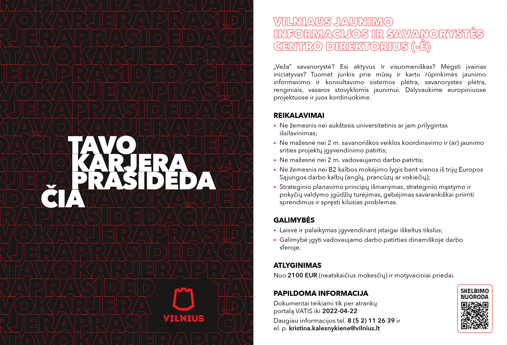 Savanoriška veikla užsiimanti įstaiga įsitikinusi, kad savanorystės projektai ir darbas VJSIC yra ne tik pareigos, o gyvenimo būdas. Centras ieško būtent tokio direktoriaus ar direktorės.