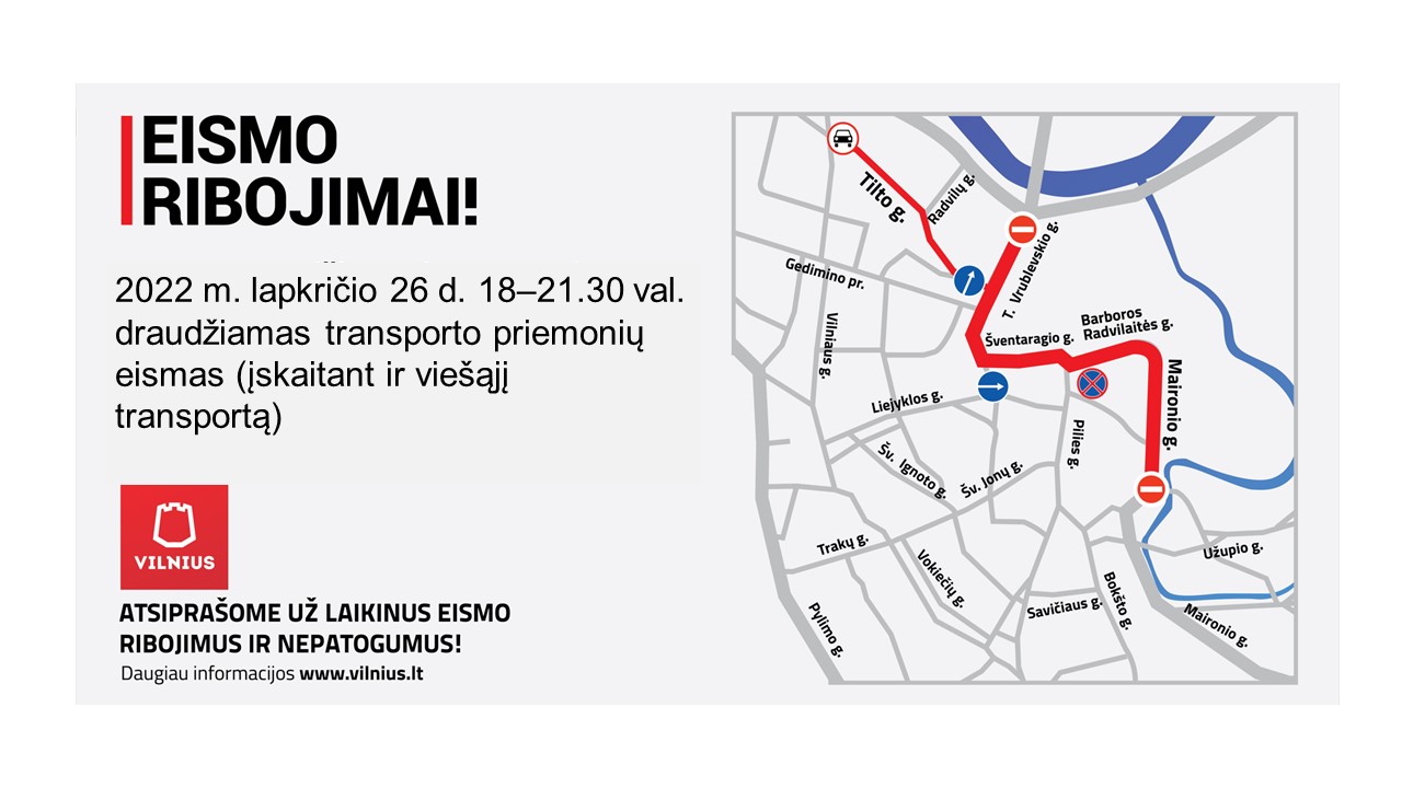 Renginio metu lapkričio 26 d. nuo 18 iki 21.30 val. bus draudžiamas transporto priemonių eismas T. Vrublevskio, Šventaragio ir Barboros Radvilaitės gatvėse.