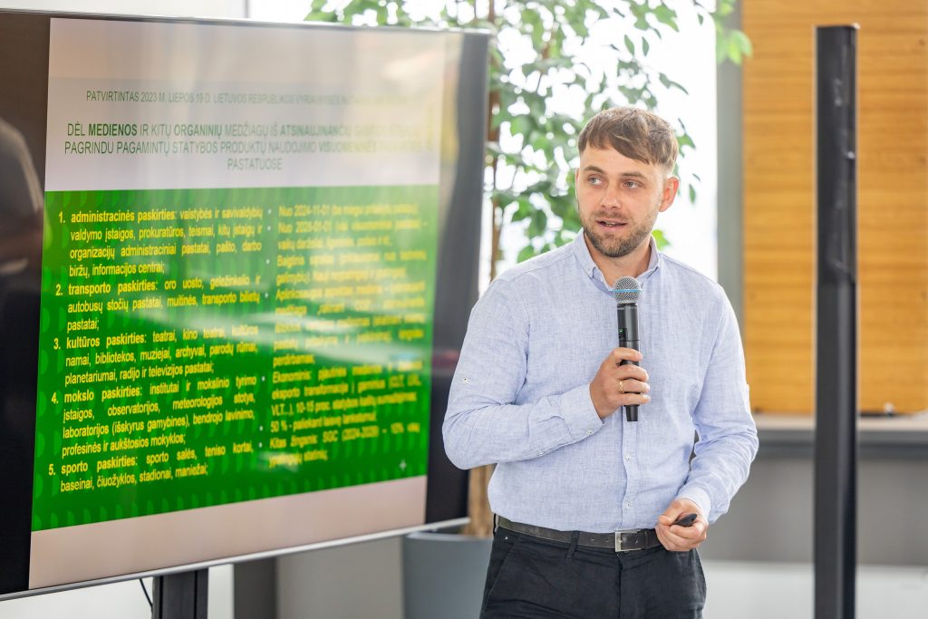 „Yra du svarbūs aspektai, dėl kurių priimtas toks nutarimas. Pirmasis – aplinkosauginis: mediena – lyderiaujanti medžiaga „užrakinant“ CO2, tai atsinaujinantis išteklius, mediena lengvai perdirbama. O kitas – ekonominis. Šiuo metu Lietuvoje vyrauja pjautinės medienos ir žaliavos eksportas. Siekiame, kad čia, vietoje, ji būtų apdirbama ir naudojama statybose. Tai padėtų sumažinti 10–15 proc. statybos kaštų“, – pateikia skaičius Artūras Sakalauskas, Aplinkos ministerijos Architektūros ir inovacijų skyriaus vyriausiasis patarėjas.