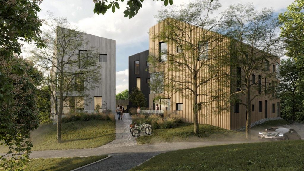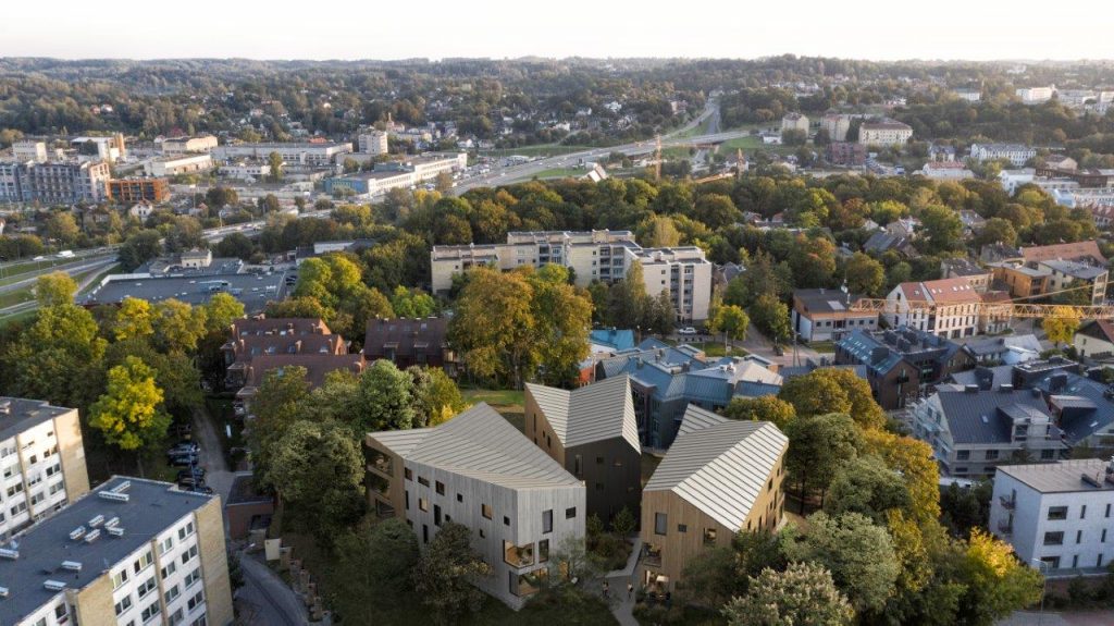 Pastatą projektavusių architektų teigimu, projektuojamą pastatą stengtasi darniai įlieti į bendrą vietos kontekstą. Aplinkoje vyrauja taškinis užstatymas, todėl, siekiant atitikties masteliui, kompleksas suskaidytas į tris tūrius su šlaitiniais stogais. Derinantis prie reljefo, kiekvienas tūris statomas skirtingame lygyje, o pastatų stogai kartoja kalvos siluetą. Vizualiai smulkinant objekto mastelį, taikomos skirtingų spalvų pastatų apdailos medžiagos, kiekvienas tūris individualiai segmentuojamas.