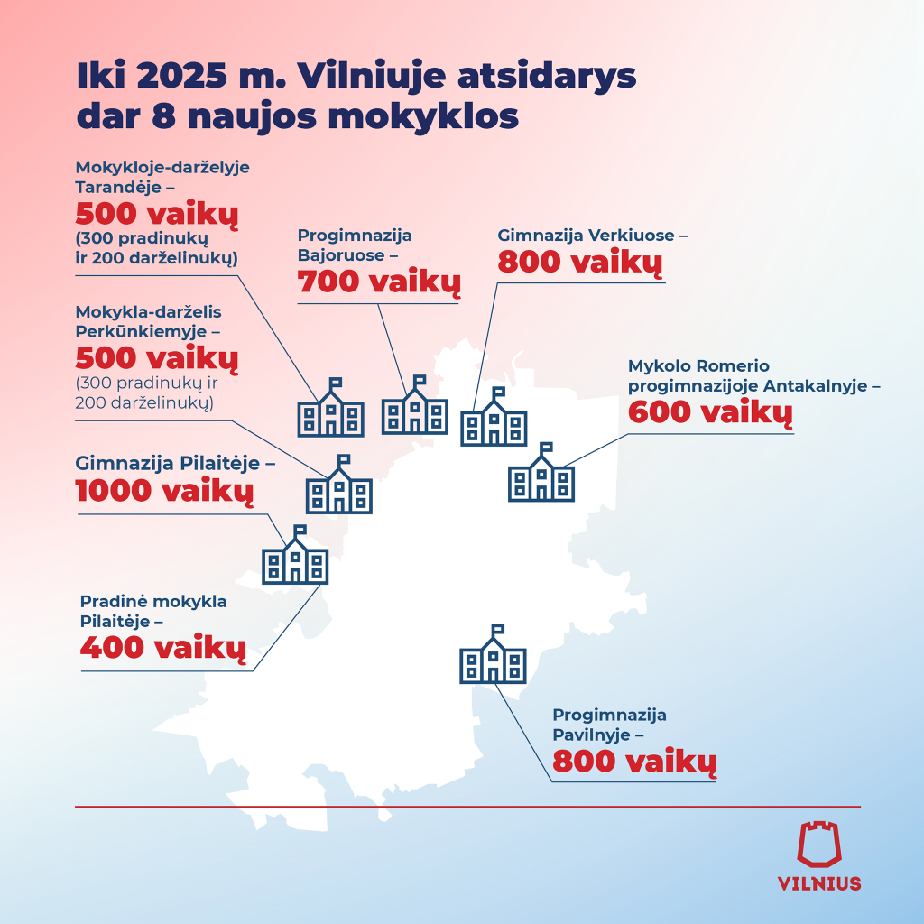 Sparčiai augantis Vilnius išsiskiria didžiausiu mokinių skaičiumi (64 tūkst.) ir toliau augs – savivaldybės atlikta analizė parodė, kad iki 2025 m. mokinių daugės maždaug 14 tūkst., t. y. sieks mažiausiai 78 tūkst. Šiandien miesto Taryba pritarė sprendimui per artimiausius keletą metų Vilniuje atidaryti dar 8 naujas mokyklas. Tai tik dalis visos planuojamos mokyklų pertvarkos.