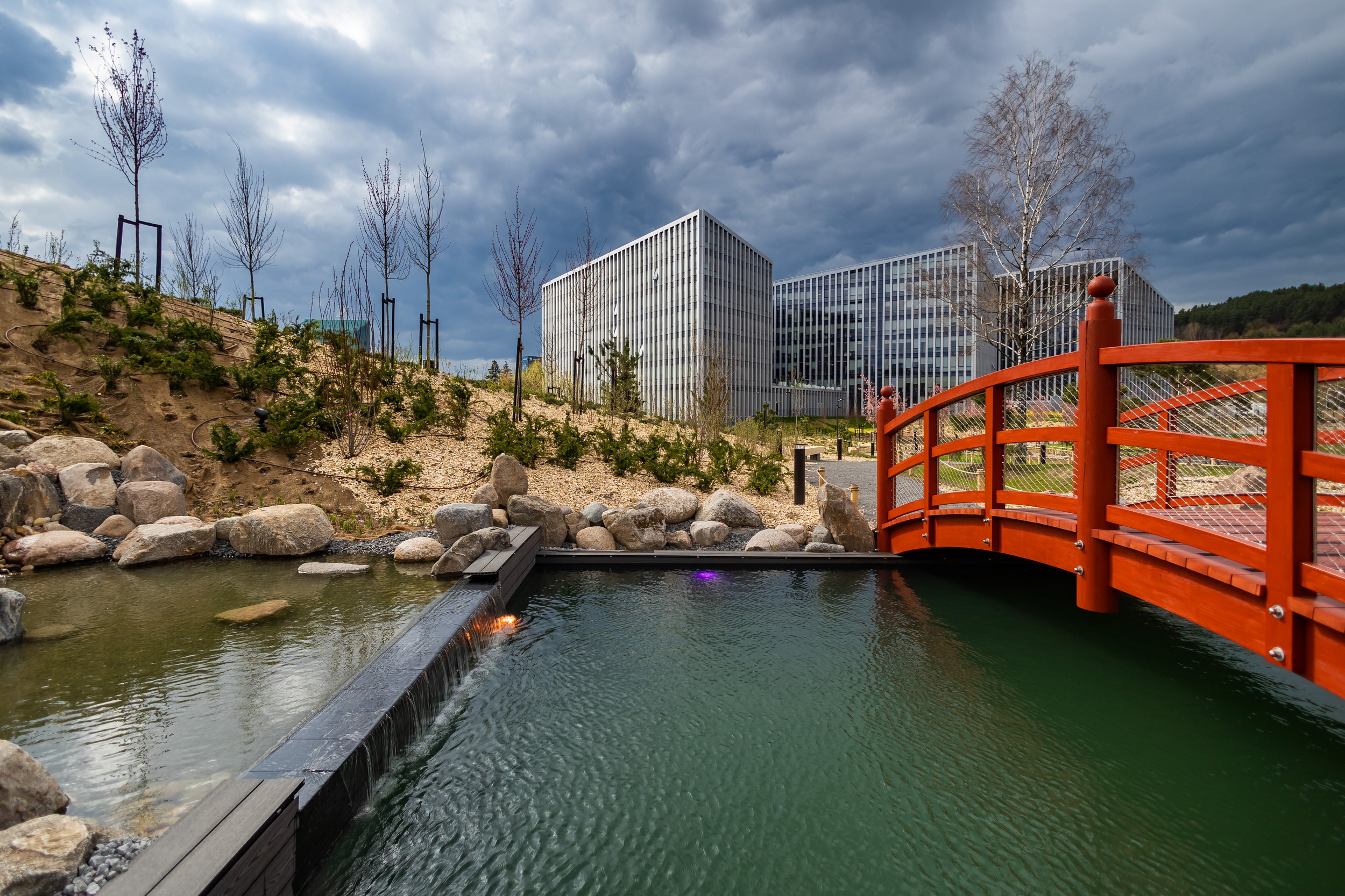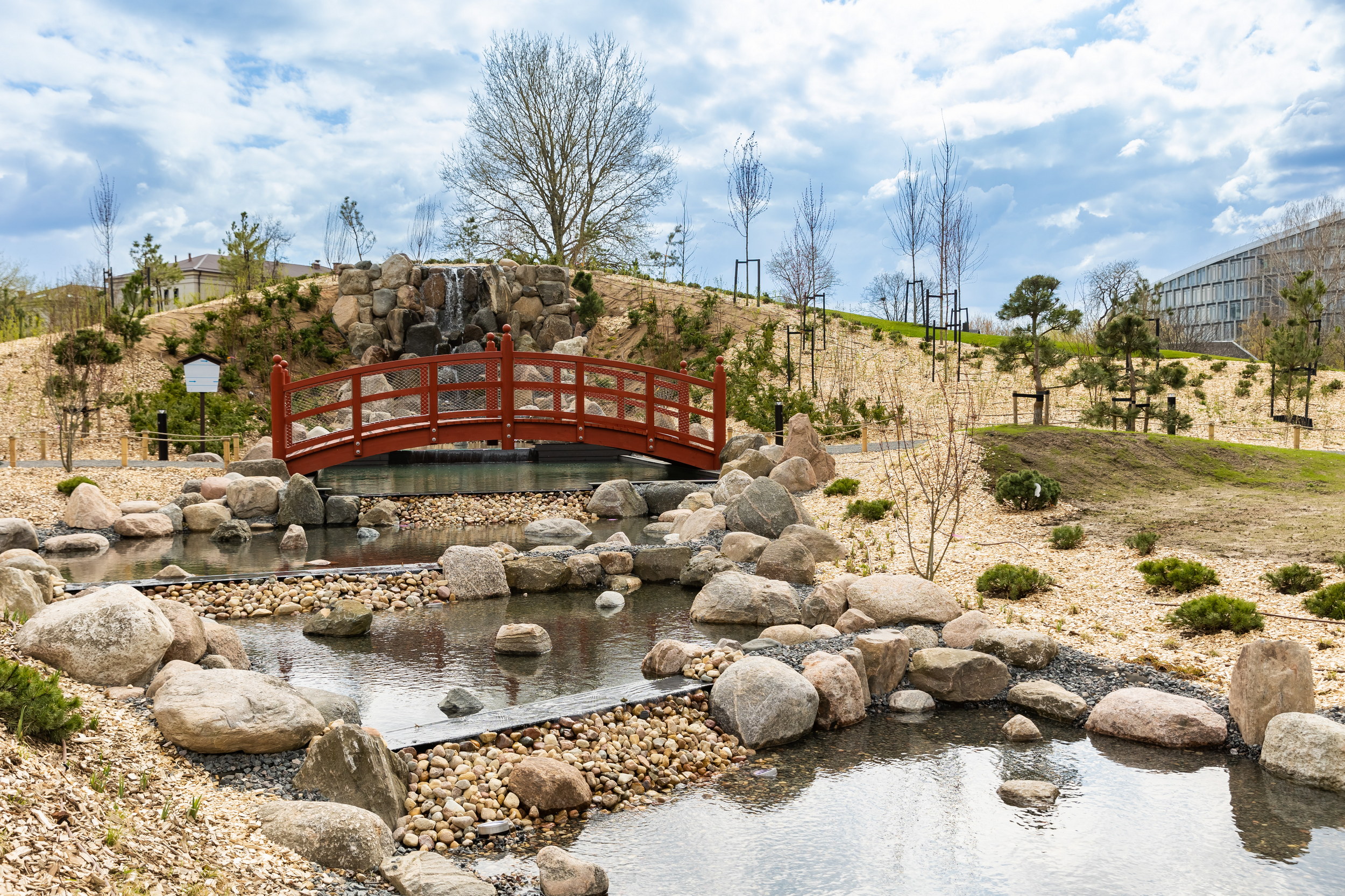 Penkių hektarų ploto Japoniško sodo centre tyvuliuojantį tvenkinį galima apžiūrėti ne tik iš tolo, bet ir vaikštant pontoniniu tiltu. Tilteliai ves ir pro krioklį, kaskadas, žuvų baseinus ir sausąsias upes.