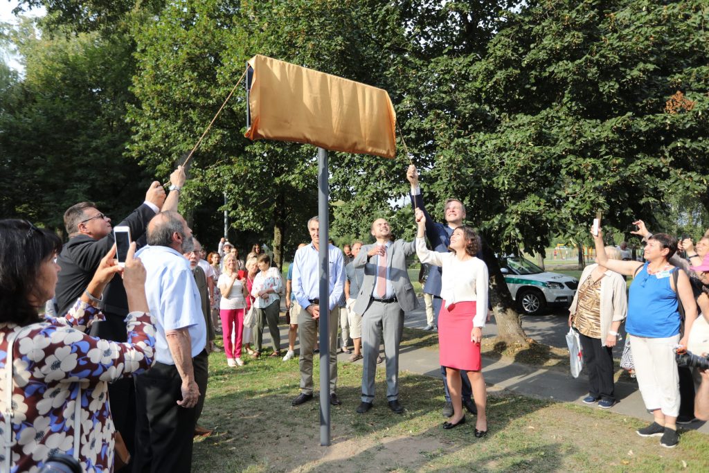 Už sukurtą dailią lentelę dviem kalbomis Savivaldybė dėkoja jos dizaino projekto autoriams – VGTU Architektūros fakulteto Dizaino katedros vedėjui profesoriui Jonui Jakaičiui ir lektoriui Mindaugui Užkuraičiui.