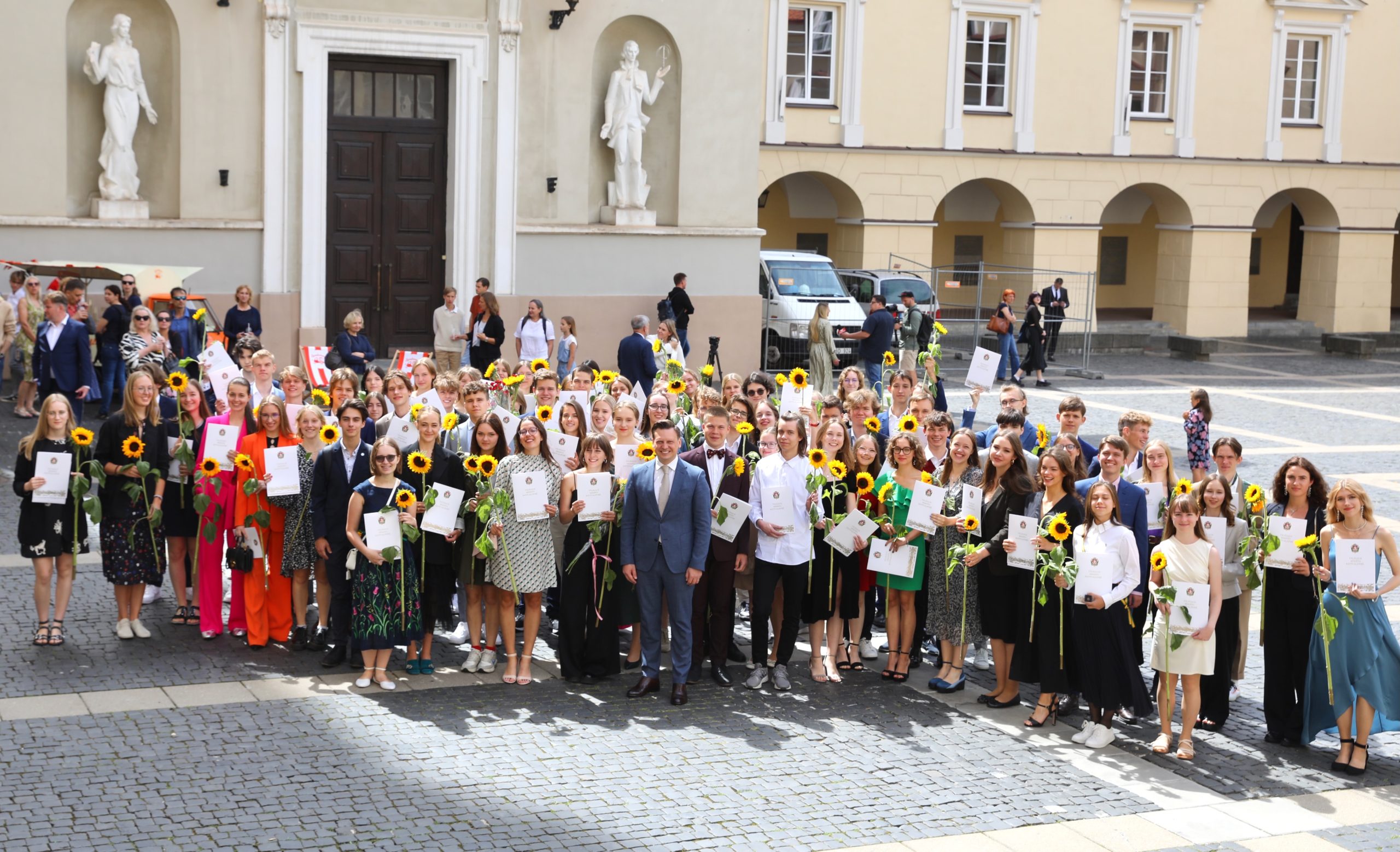 „Nesvarbu, kur studijuosite: šiame, kituose universitetuose, kitose šalyse. Ši diena jau rodo, kad sugebėjote pasiryžti, nepasiduoti rutinai ir sistemingai dirbti. Tikiu, kad mokyklos suole išgyvenote įvairių akimirkų – ir nuviliančių atsiskaitymų, ir nesuprantamų klausimų, ir kartais nuobodžių skaitymų. Tačiau neabejotinai įgijote naujų žinių ir draugų ilgam galbūt net visam gyvenimui. Viskas, ką įgijote, yra jūsų rankose. Kaip tai panaudosite – taip pat. Linkiu, kad visa, ką turite, sužinojote, išmokote, liktų nuolat su jumis – auginkite tai, nes tai tik jūsų augimo pradžia“, – abiturientams kalbėjo Vilniaus universiteto prorektorė Vilmantė Pakalniškienė.