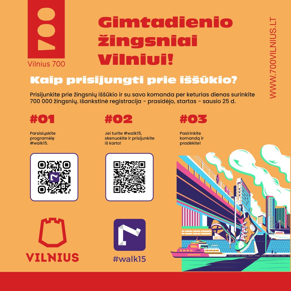 Vilniui pasitinkant 700 metų gimtadienį, nemokamos vaikščiojimo programėlės „#walk15“ komanda visus norinčius kviečia prisijungti prie reikšmingos iniciatyvos – žingsnių iššūkio „Gimtadienio žingsniai Vilniui“.