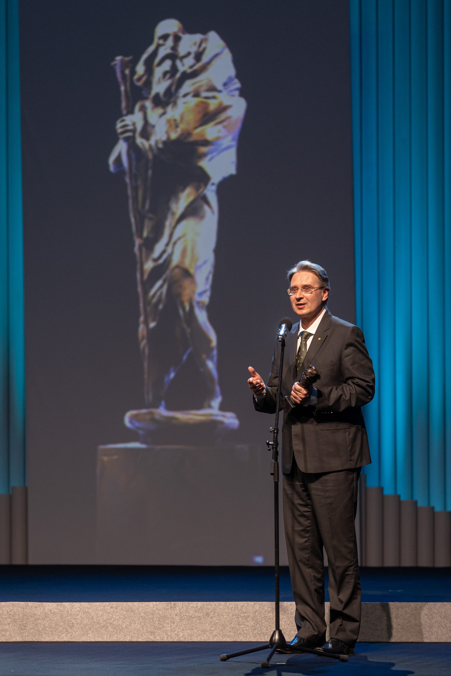 Žurnalistas, rašytojas ir visuomenininkas Andrius Tapinas Šv. Kristoforo statulėle apdovanotas už daugybės žmonių sutelkimą ir įkvėpimą aukoti už savo laisvę kovojantiems Ukrainos žmonėms, už aukotojų ir savanorių rankomis paleistas karinių bepiločių dronų ir kitas laisvės vėjo Ukrainai iniciatyvas.