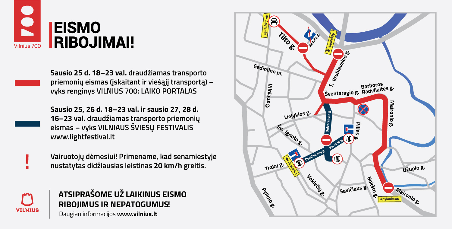 Sausio 25–26 d. 18–23 val., o sausio 27–28 d. 16–23 val. bus draudžiamas transporto priemonių eismas Universiteto, Dominikonų, Šv. Jono, Švarco gatvėmis ir Gaono gatvės atkarpa nuo Švarco g. iki Šv. Jono g.