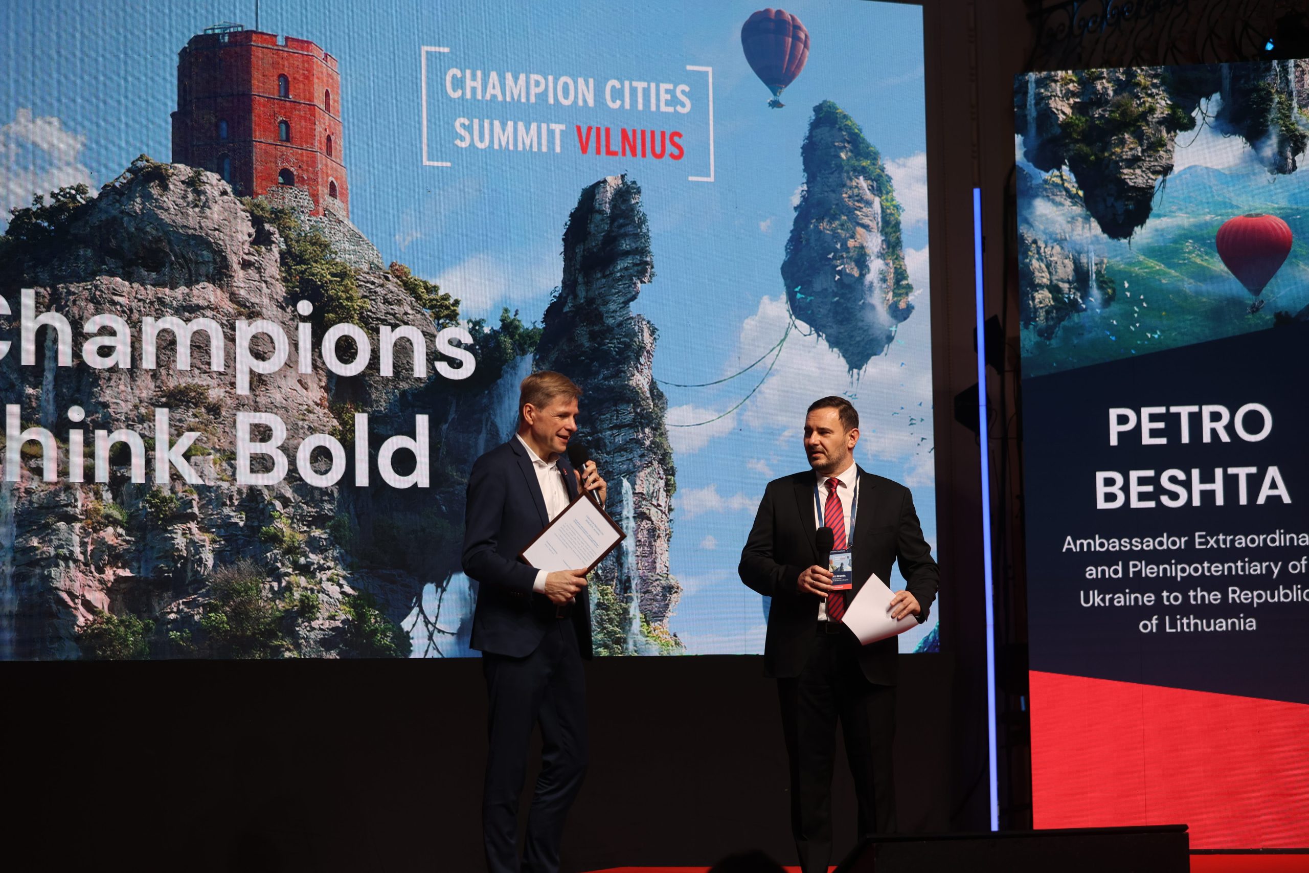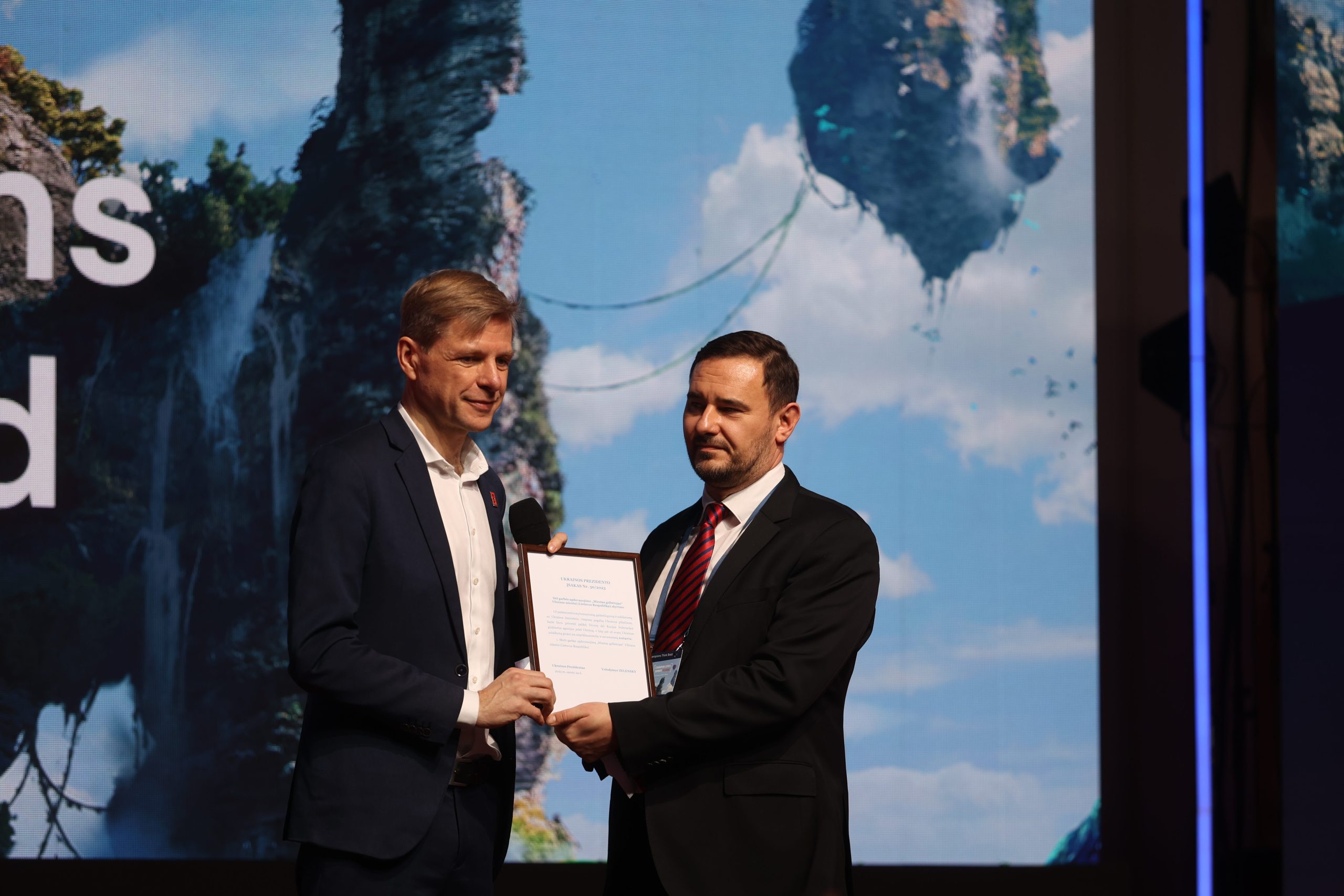 700-ojo gimtadienio proga sostinėje šiandien vykstančioje tarptautinėje konferencijoje „Champion Cities Summit 2023“ Vilniui už paramą Ukrainai suteiktas Prezidento Volodymyro Zelenskio dekretu pasirašytas „Miesto gelbėtojo“ garbės titulas.