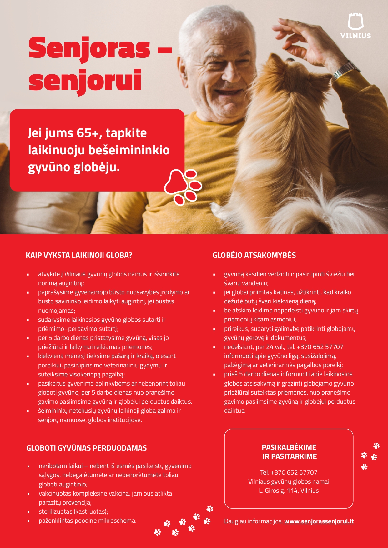 Sostinė pradeda analogų šalyje neturinčią „Senjoras – senjorui“ programą – kviečia vyresnio amžiaus vilniečius tapti šeimininkų netekusių, dažniausiai garbaus amžiaus, keturkojų augintinių globėjais. Jiems Vilniaus miesto savivaldybė suteiks visas priežiūros priemones, pasirūpins pašaru ir kraiku, prireikus, veterinarinėmis paslaugomis.