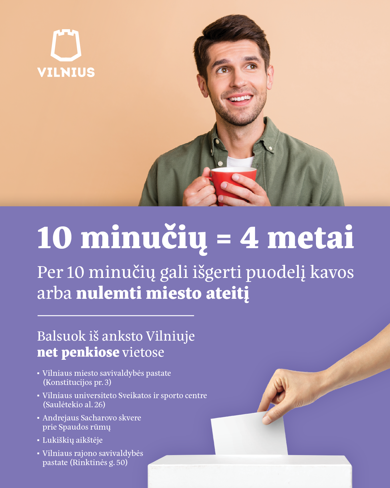 Jau rytoj Vilniuje prasideda išankstinis balsavimas savivaldybės tarybos ir mero rinkimuose. Negalėsiantys atvykti balsuoti savo rinkimų apylinkėje sekmadienį, turi galimybę tai padaryti iš anksto. Balsuoti iš tiesų labai paprasta ir ilgai netrunka – kai jau esi apsisprendęs, už ką, – tačiau šis veiksmas lemia tai, kaip gyvensime ateinančius ketverius metus. Kiekvienas balsas svarbus renkantis žmones, kurie atstovaus tavo interesams, kurs ateities Vilnių.