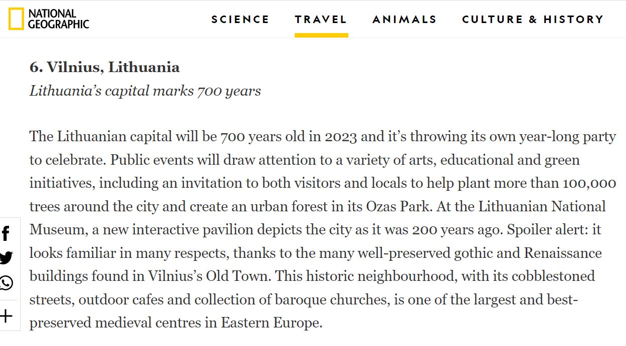 Vilnius atsidūrė ir „National Geographic Traveler“ kasmet sudaromame geriausių pasaulio vietų sąraše „Best of the world: 35 destinations for 2023 and beyond“. Sąrašą sudaro kelionių ekspertai, kurie vertina kelionių kryptis pagal penkias skirtingas kategorijas – kultūros, gamtos, nuotykių, bendruomenių ir šeimos. Lietuvos sostinė įvertinta kaip viena geriausių kultūros kategorijoje.