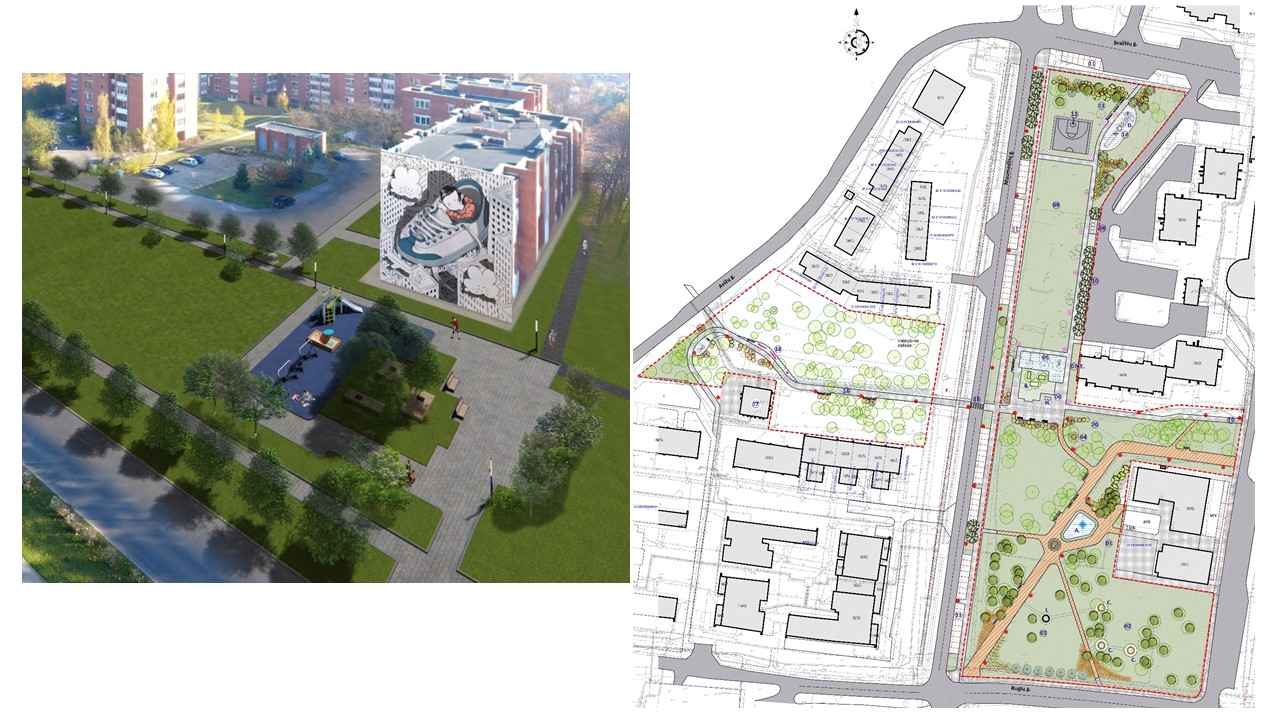 Nuo bendruomenės parko iki Braškių gatvės driekiasi apie 0,6 ha ploto viešoji erdvė, kurioje buvo įrengta vaikų žaidimo aikštelė su žvyro skaldos pagrindu. Prie Braškių g. buvo įrengta asfalto dangos krepšinio aikštelė su atitvaru nuo gatvės pusės. Šalia aikštelės įrengti lauko treniruokliai, suoliukai. Šioje teritorijoje projektuojama žaidimų pieva arba nedidelio modulinio vaikų lopšelio-darželio įrengimas prie esamų atvirų sporto aikštelių.